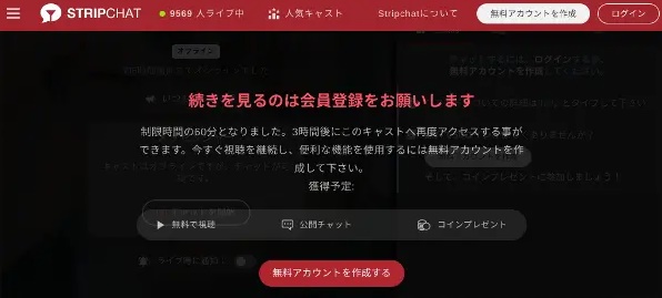 ただし、STRIPCHATにログインをしていない状態、つまり非会員の状態だと無料チャットの視聴制限60分までしか出来ませんでした。