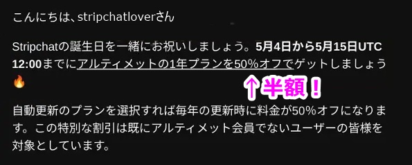 割引キャンペーンが発動した場合、当サイトでも出来るだけ早くにこのページでお知らせをしていくつもりなのですが、STRIPCHATから直接情報を受け取る方法もありますので解説をします。
