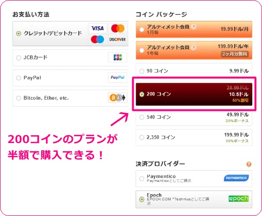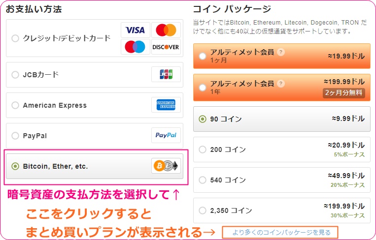 ちなみに、支払方法をクレジットカードなどにすると最大のまとめ買いプランは2350コイン分までになるのですが、ビットコインなどの暗号資産で支払いをする場合には最大62850コインもの大量のまとめ買いが出来るプランが表示されますので、コスパを極めたいかたは暗号資産での購入がオススメです。