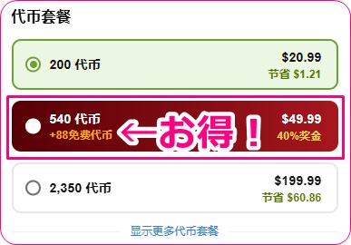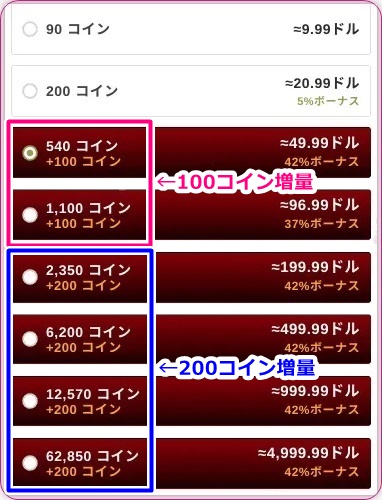 540コインのプランで購入すると追加で88コインもボーナスが貰えてしまうのでめちゃくちゃお得になっています!
