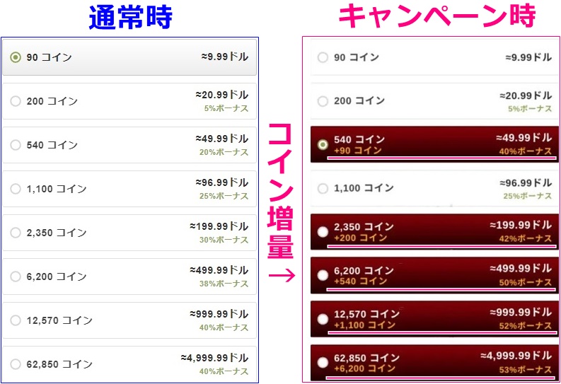 540コイン以上まとめて購入すると通常時に比べて増量している事がわかるかと思います。なぜか1100コイン購入時には適用されなかったのですが(苦笑)