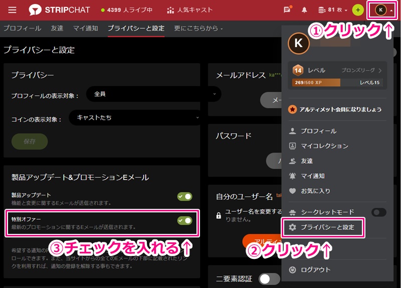 STRIPCHATトップページの左上メニューをクリックして、【プライバシーと設定】に移動します。さらに特別オファーの欄を確認してチェックが入っている状態にします。