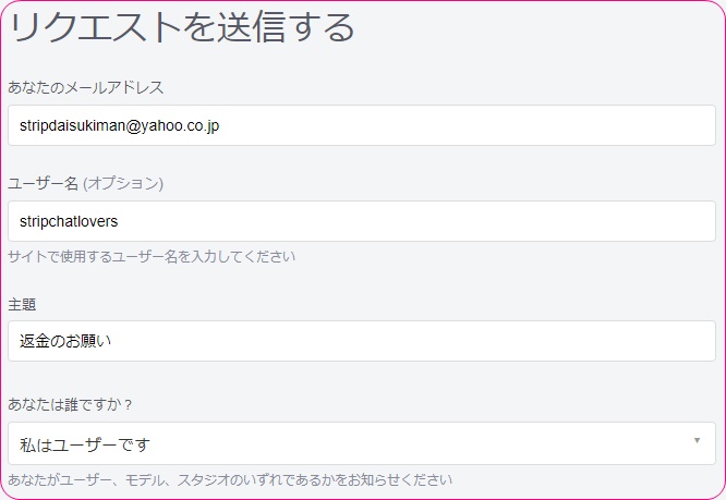 問い合わせページを開いたら、STRIPCHATの登録時に使用したメールアドレスやユーザー名を入力します。