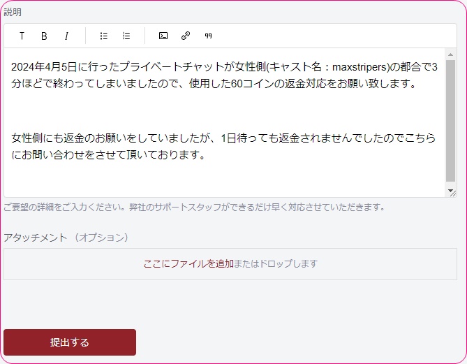 基本的に女の子の事情や運営の不備があった際に返金が出来ますので、それを証明するようなスクリーンショットの画像を添付してあげると運営さんに親切かなと思います。