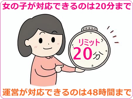 20分以内であれば女の子へ連絡をし、20分以上48時間以内であれば運営に連絡をして返金して貰いましょう。