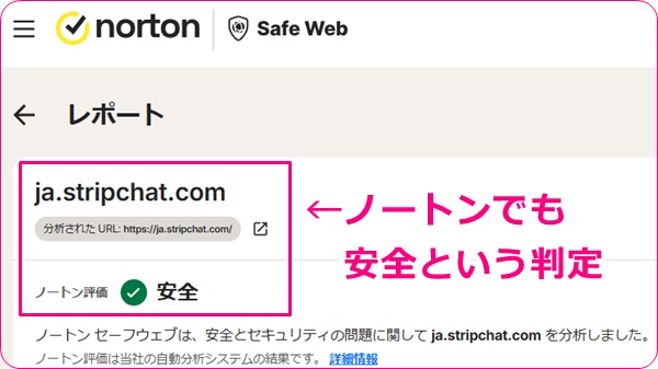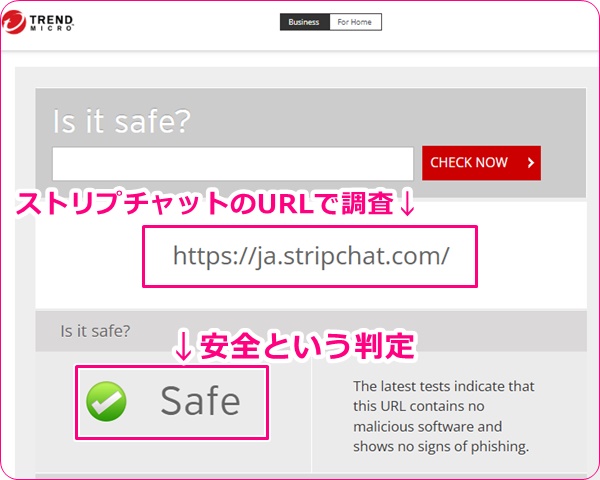 ウイルス対策で有名なトレンドマイクロのウェブ上サービスを使ってSTRIPCHATのURLをテストしてみたところ、安全であるという判定になりましたので、ウイルスなどの危険性が無いという証拠としても十分かなと思います。
