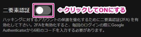 その画面の右下の方に『二要素認証』という場所がありますので、ボタンをクリックしてONにしましょう。
