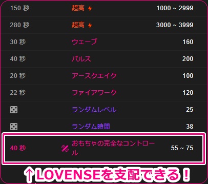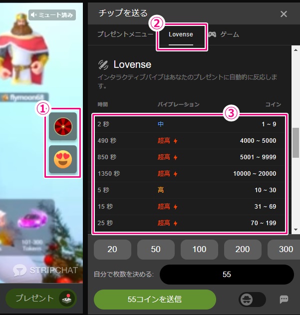 例えば、上記の表で言えば1〜9コインをプレゼントすると2秒間の中くらいの振動でLOVENSEを発動させる事が出来ますが、10コイン使うと5秒間の高い振動で発動されます。