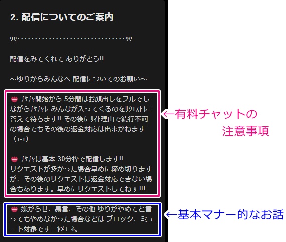 チャット映像の上部に『プロフィール』というボタンがありますので、そちらをクリックして下の方にスクロールすると注意事項が書いてある事があります。