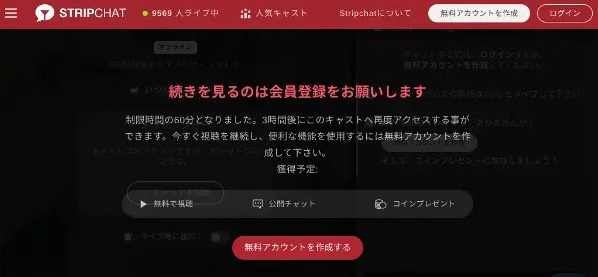 3時間経過するとこの制限が解除されて再び60分間視聴できるようになりますので、途中退出させられる事に抵抗が無いのであれば無理にSTRIPCHATに会員登録をする必要はありません。
