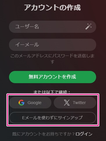 アカウント作成画面で、GoogleボタンやTwitterボタンを押すとそのアカウントでSTRIPCHATに会員登録をする事が出来ますので、メールアドレスの入力などを省略する事が出来ます。