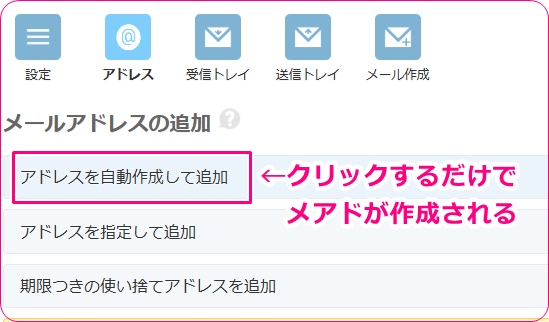 Google検索などで『捨てアド』と検索すれば色々なサイトが出てくるのでどこを使って頂いてもOKですが、例えばメルアドぽいぽいというサイトを使うと、ワンクリックで一瞬でメアドが作成できます。